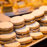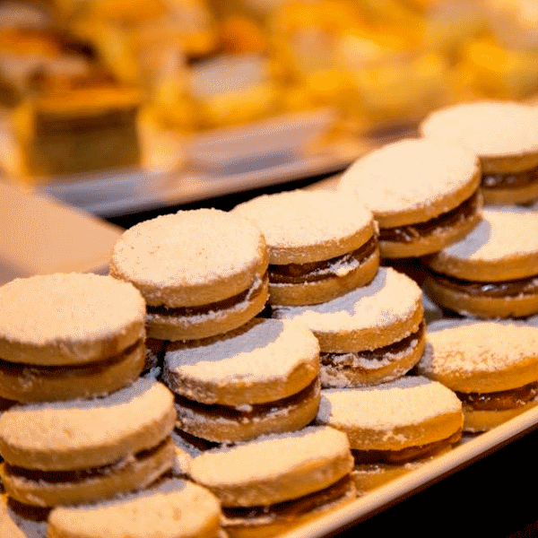 Crispy and crunchy cornstarch cookie with manjarblanco. Crocante y crujiente alfajor de maizena relleno con manjarblanco.