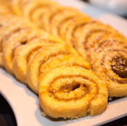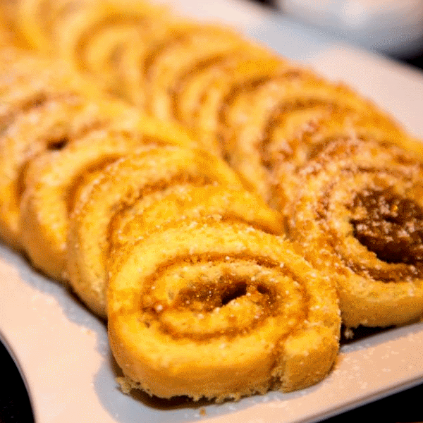 Soft and fluffy roll of conrstarch with manjarblanco filling. Suave y esponjoso rollo de maizena relleno con manjarblanco.
