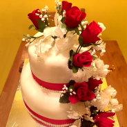Red roses wedding cake made with traditional fruit cake and sweet fondant.