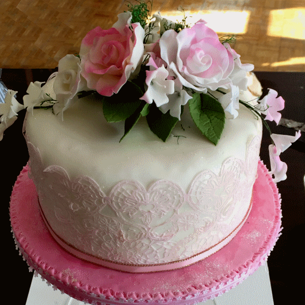 For any romantic occasion. A wedding fruit cake decorated with sugar roses and fine sugar tracey.