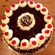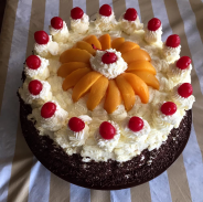 Chocolate and cream fruit cake. Torta de chocolate con cerezas y crema chantilli.