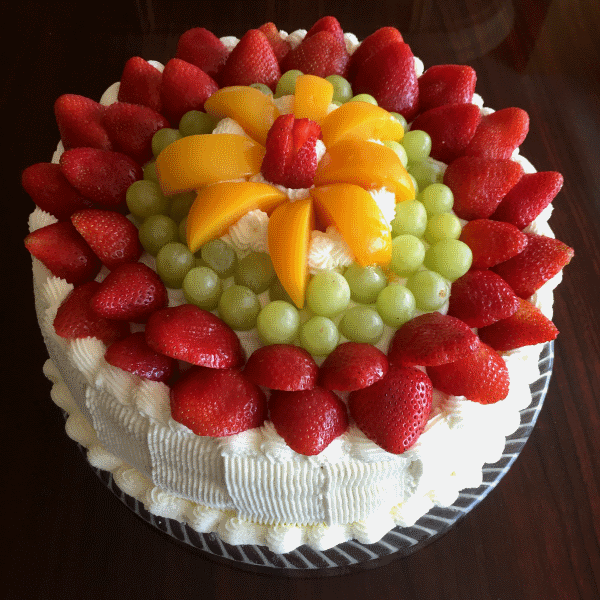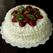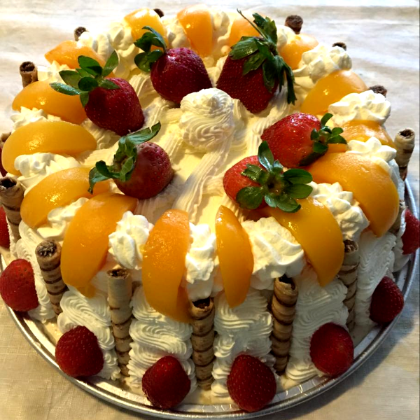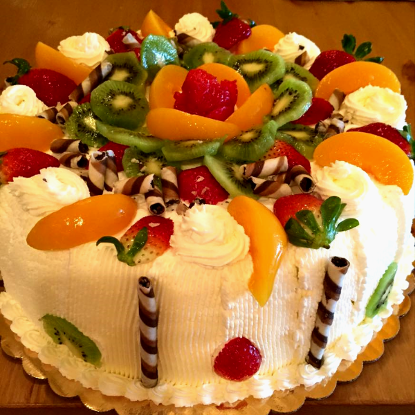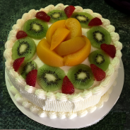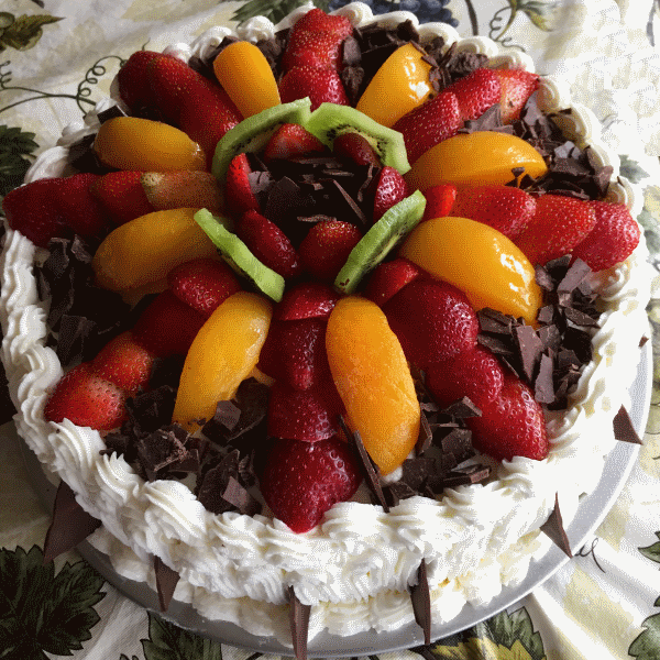 Peach Kiwifruit, Strawberry and cream fruit cake. Torta de Duraznos Kiwi y fresas con crema chantilli.